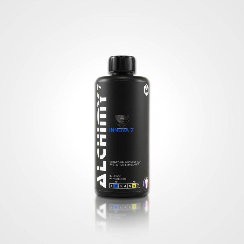 Alchimy7 INNOVA 7 est un shampooing intégrant des perles de nacres, des nano-polymères, de la céramique (Silice SiO²), des tensio-actifs et des cires.